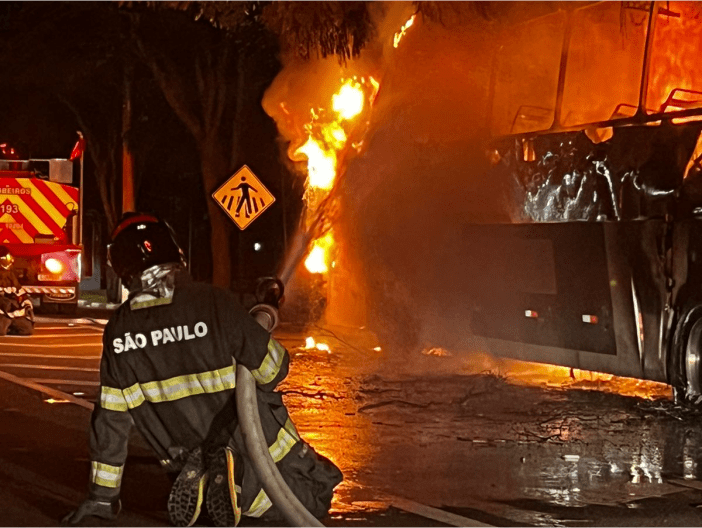 Um ônibus da empresa Viação Bragança coligada à Viação Danúbio Azul, pegou fogo na noite desta sexta-feira, (05), na Avenida Dom Pedro I, no Lago do Taboão, em Bragança Paulista.
