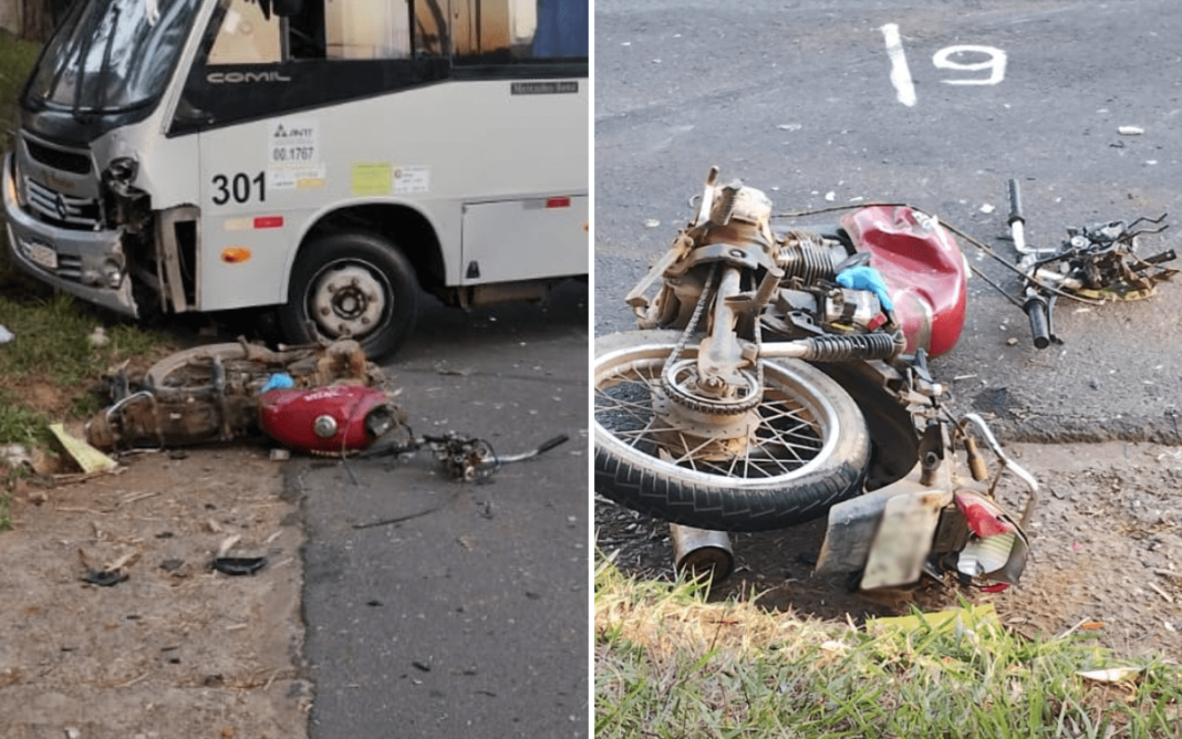 Para desviar da pedestre e evitar o atropelamento, o motorista desviou o ônibus para a contramão de direção, colidindo frontalmente com uma motocicleta Honda Fan vermelha que seguia no sentido contrário.