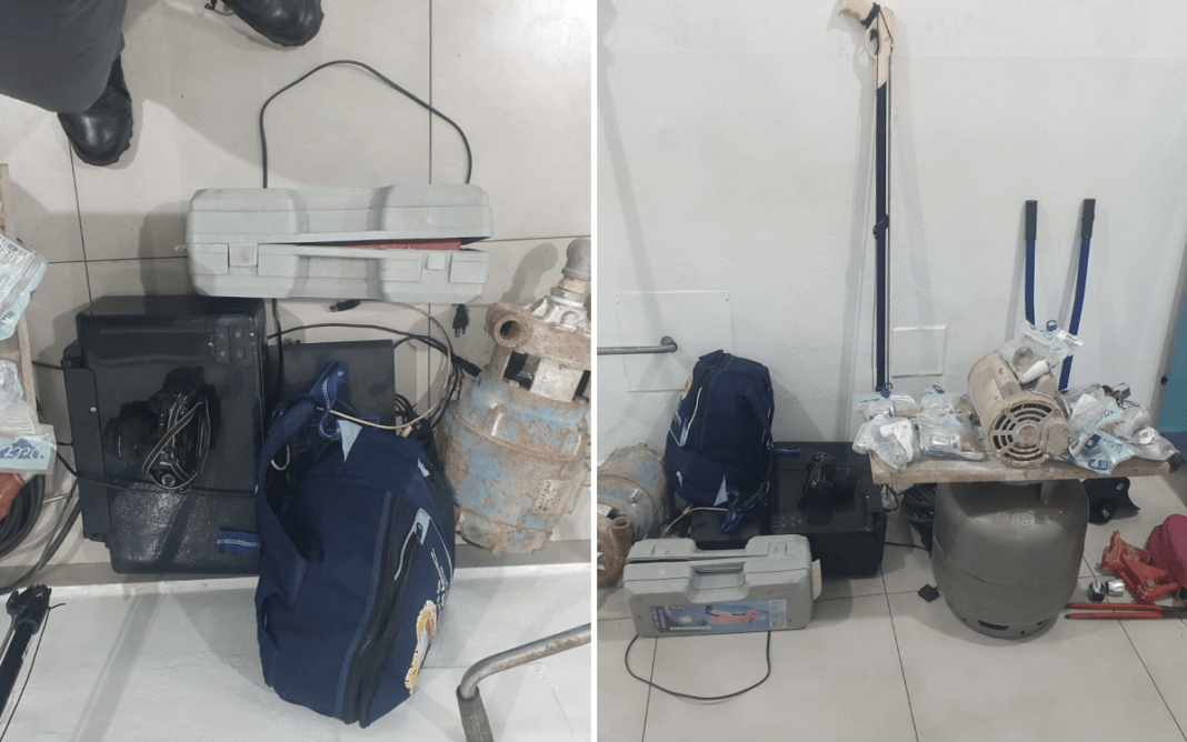 Em determinado momento, um dos indivíduos foi avistado saindo do mato e, ao ser abordado, foi encontrada uma mochila contendo registros hidráulicos e um aparelho celular. As características físicas e de vestimentas do suspeito coincidiam com as descritas pelo solicitante.