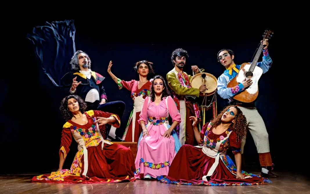 A história é contada a partir da fusão de referências da cultura europeia do século XVII com influências do folclore popular brasileiro e de tradições afro-brasileiras, trazendo à cena um espetáculo visualmente colorido, alegre e ritualístico. Seus personagens são inspirados nos tipos da Commedia Dell’Arte e em sua relação com os tipos atuais de representação do poder e seu campo imagético estará ligado ao folclore popular brasileiro com elementos carnavalescos e de festas como a do bumba meu boi e a rituais de divindades como a Pombagira, como representação da sensualidade e libertação feminina.