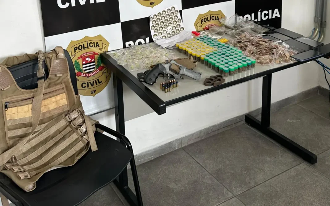 Além das drogas, foram encontrados um revólver calibre .38 com numeração raspada, 17 munições intactas de calibre 9mm, uma capa de colete balístico e um coldre.