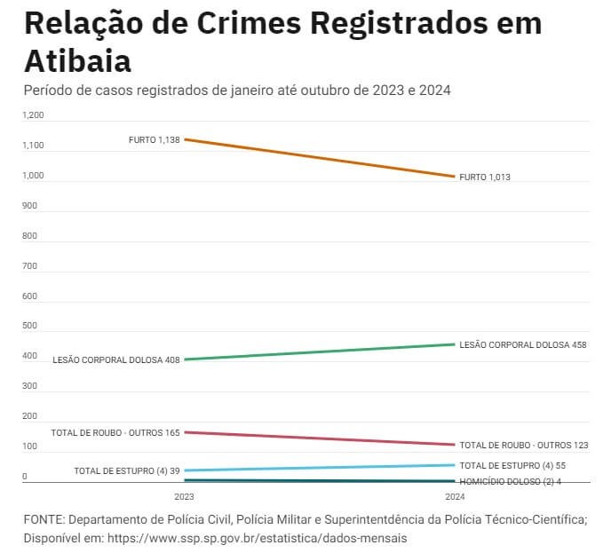 - Entre janeiro e outubro de 2023 e 2024, em Atibaia, houve um aumento no número de casos registrados quanto ao crime, passando de 408 casos para 458.