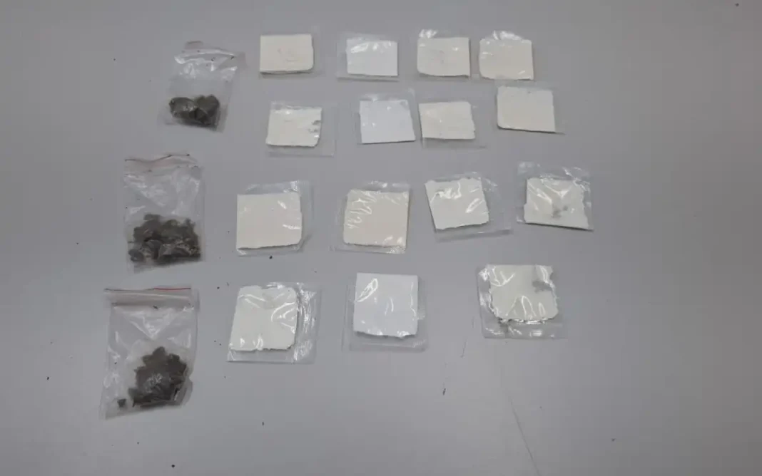 Os policiais se aproximaram de forma estratégica e localizaram o indivíduo com as características descritas. Durante a abordagem e busca pessoal, foram encontrados, dentro da bolsa tipo shoulder bag, 15 invólucros de cocaína e 3 invólucros de maconha.