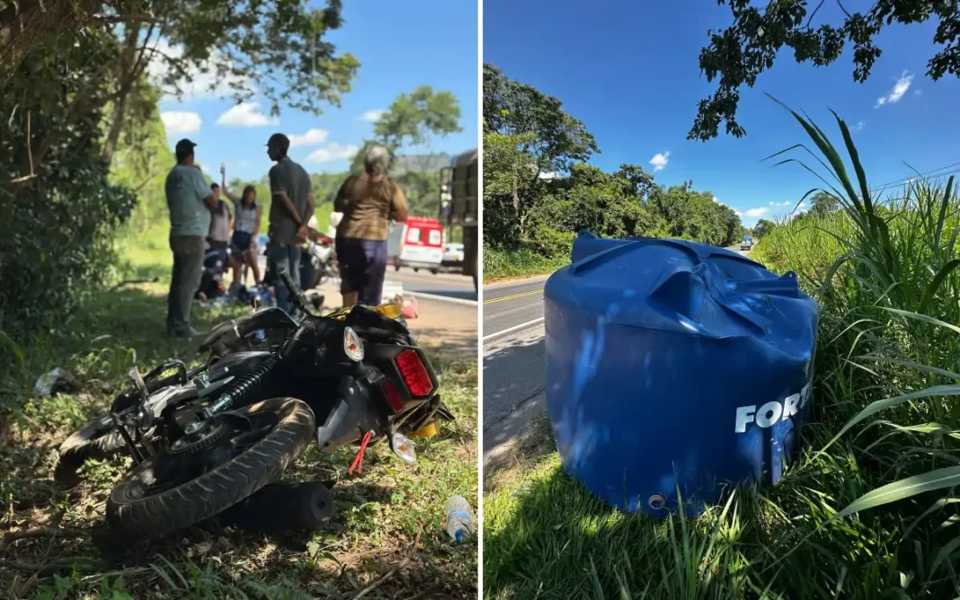 Na tarde desta quinta-feira (6), um motociclista ficou ferido após sofrer uma queda na Rodovia Alkindar Monteiro Junqueira. O acidente ocorreu quando uma caixa d’água de 10 mil litros se soltou de um caminhão e atingiu o condutor da moto.