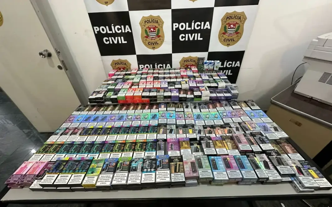 Durante a operação, foram localizados 339 cigarros eletrônicos prontos para comercialização, além de materiais de divulgação relacionados a uma marca popular desses produtos.