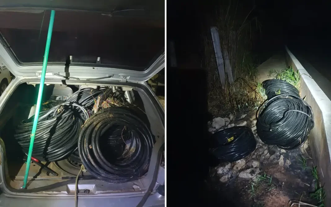 Durante a vistoria no interior do veículo, foram encontrados três rolos de cabos telefônicos de cobre, com identificação da operadora VIVO, aparentemente recém-cortados. Em uma varredura pelas imediações, outros rolos do mesmo material também foram localizados, cortados e prontos para transporte.