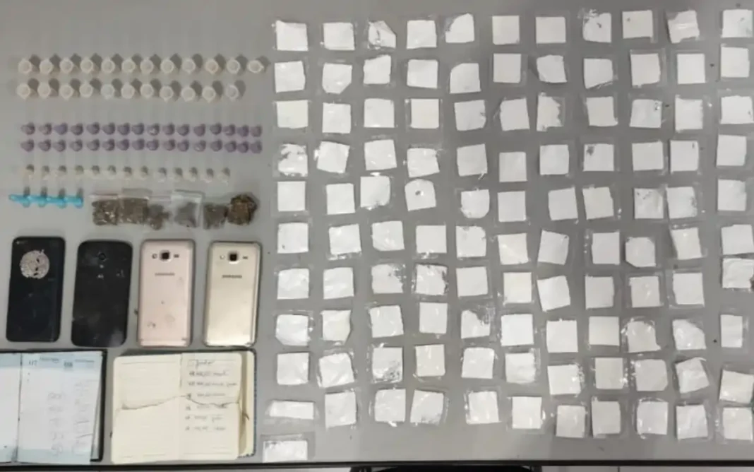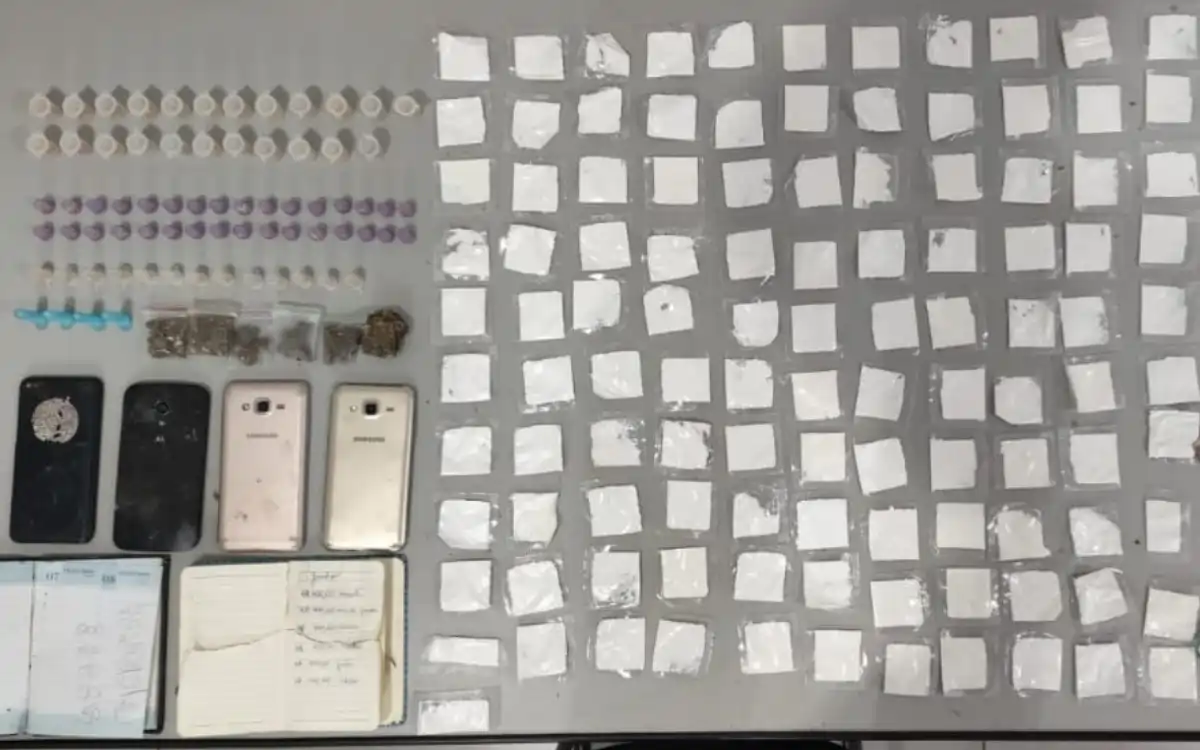 Ao todo, foram apreendidas 68 porções de crack, 115 porções de cocaína, seis porções de maconha, R$ 112,15 em dinheiro e um caderno com anotações sobre a comercialização das drogas.