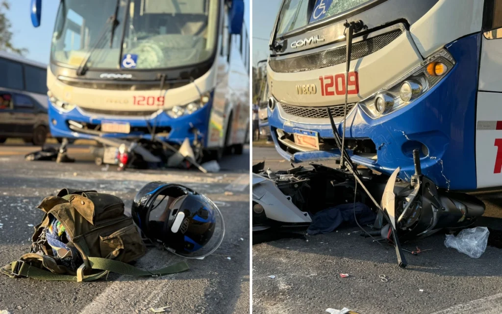 A colisão envolveu um ônibus de uma empresa de fretamento e turismo, conduzido por um homem de 42 anos, e uma motocicleta Honda Biz 125, conduzida por um motociclista de 69 anos.