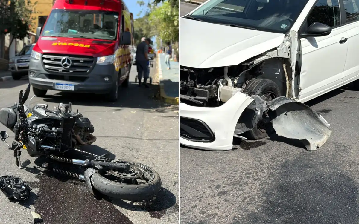 Segundo informações, por razões ainda a serem esclarecidas, os dois veículos colidiram. O impacto foi tão forte que arrancou a bengala da moto e o para-lama do carro.