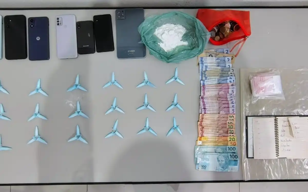 Na vistoria do veículo, os policiais localizaram 40 pinos de cocaína na porta do motorista, um saco contendo 109,98 gramas de cocaína, 102 embalagens plásticas para acondicionamento de entorpecentes, seis aparelhos celulares no porta-luvas e R$ 56,70 em moedas.