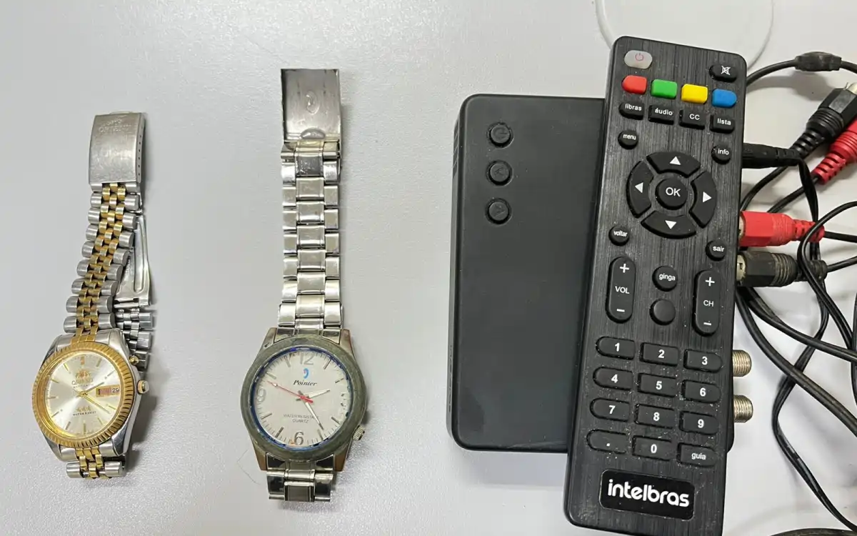 Em revista pessoal, os policiais encontraram dois relógios de marcas diversas e um aparelho de canal de TV, todos reconhecidos pela vítima como seus. Ela também relatou que o suspeito havia subtraído R$ 150,00 em dinheiro, valor que não foi localizado.
