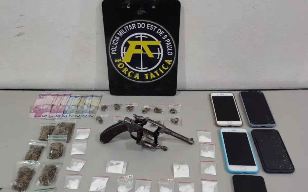 Durante a ação, os policiais localizaram um revólver calibre .38 na cintura de um dos detidos.