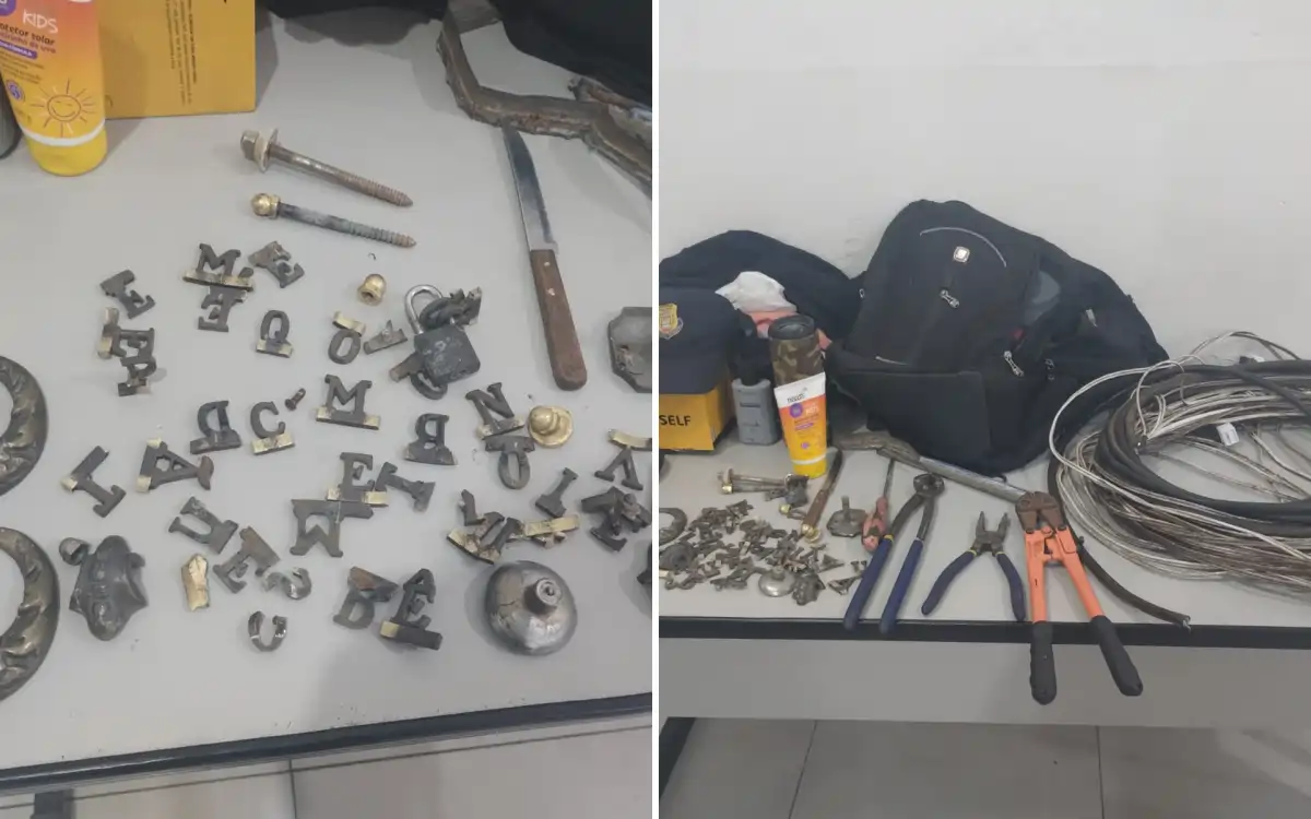 Durante a abordagem, além dos cabos cortados, os agentes localizaram em posse do indivíduo cerca de 40 letras e duas alças de jazigo, com coloração amarelada semelhante a bronze. Posteriormente, os itens foram identificados como pertencentes ao Cemitério Municipal.