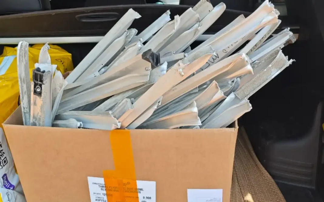 O material foi apreendido e devolvido à vítima. A estrutura era composta por 16 contramarcos de alumínio, utilizados como moldura auxiliar nas aberturas antes da instalação dos marcos principais.