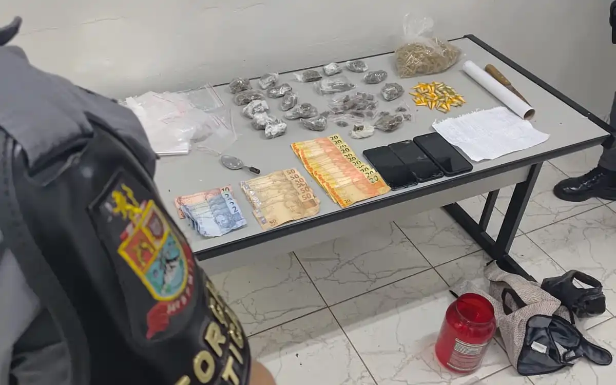 Durante a revista pessoal, foram encontrados entorpecentes, dinheiro e anotações relacionadas ao tráfico. Nas imediações, os policiais localizaram um apartamento com a porta danificada, onde foi possível visualizar mais drogas sobre um móvel da sala.