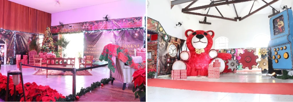 O local reúne diversas atrações temáticas, como a Fábrica de Brinquedos do Papai Noel, aposentos completos do Bom Velhinho, sala de cinema com músicas natalinas, carrossel, personagens e espaços para fotos. Crianças podem tirar fotos com o Papai Noel, receber doces e acompanhar apresentações culturais. Nos finais de semana, brinquedos infláveis complementam a programação.