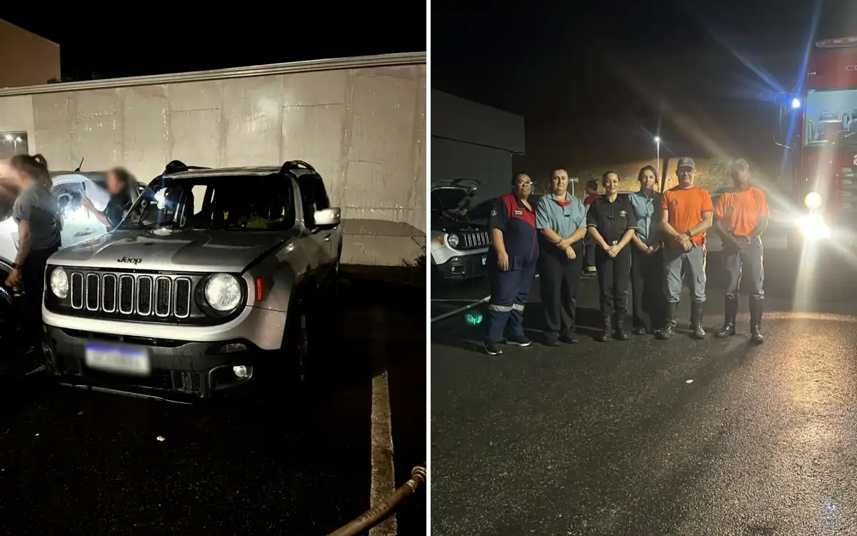 Na noite de quinta-feira (11), um Jeep Renegade pegou fogo no estacionamento de um shopping da cidade. As chamas começaram na parte dianteira do veículo e chamaram a atenção de funcionários e frequentadores.