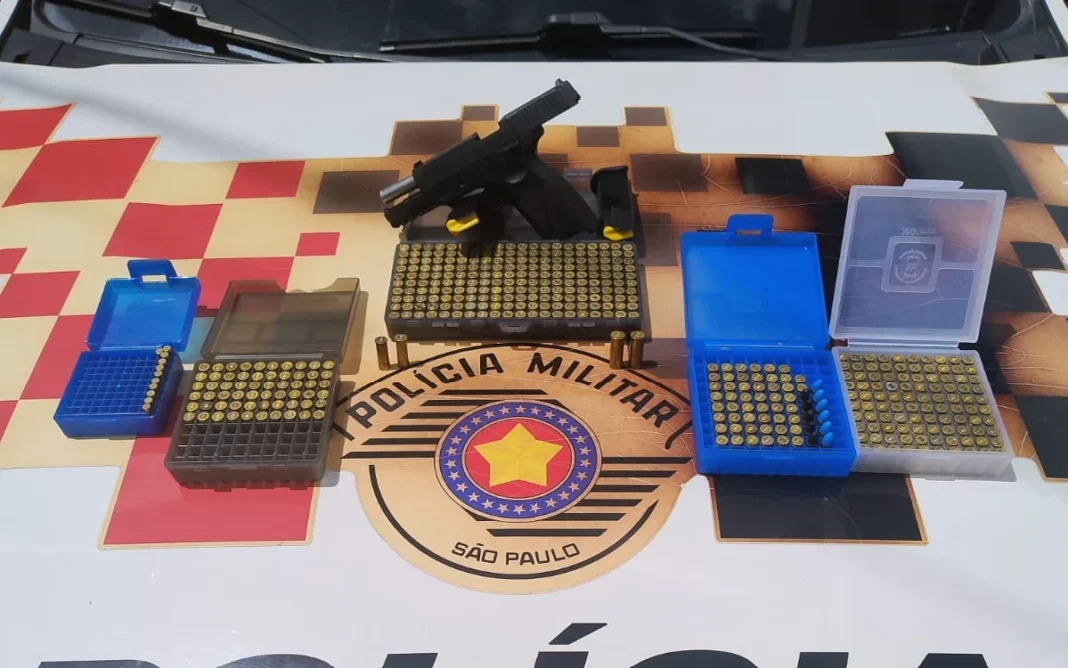 Segundo a Polícia Militar, a mãe do procurado informou que o filho possuía uma arma de fogo e cartuchos no imóvel e que temia que ele atentasse contra a própria vida. Ela autorizou voluntariamente a entrada dos policiais, que localizaram uma pistola Taurus calibre 9mm com numeração aparente, além de munições e estojos deflagrados de diversos calibres.
