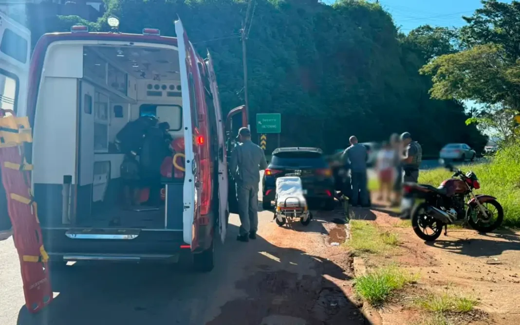 A ocorrência foi registrada por volta das 8h04, na Rua Romeu Casa Grande, nas proximidades da rotatória de acesso à rodovia — trecho conhecido pelo tráfego intenso, o que aumenta o risco de acidentes. Segundo as informações iniciais, a colisão envolveu um automóvel e uma moto.