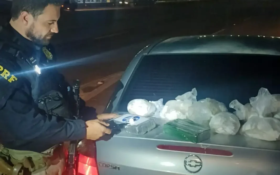 No interior do veículo, a equipe visualizou um saco plástico preto no assoalho do banco dianteiro do passageiro. Questionado sobre o conteúdo, o condutor declarou: “Pode me algemar que eu estou preso”.