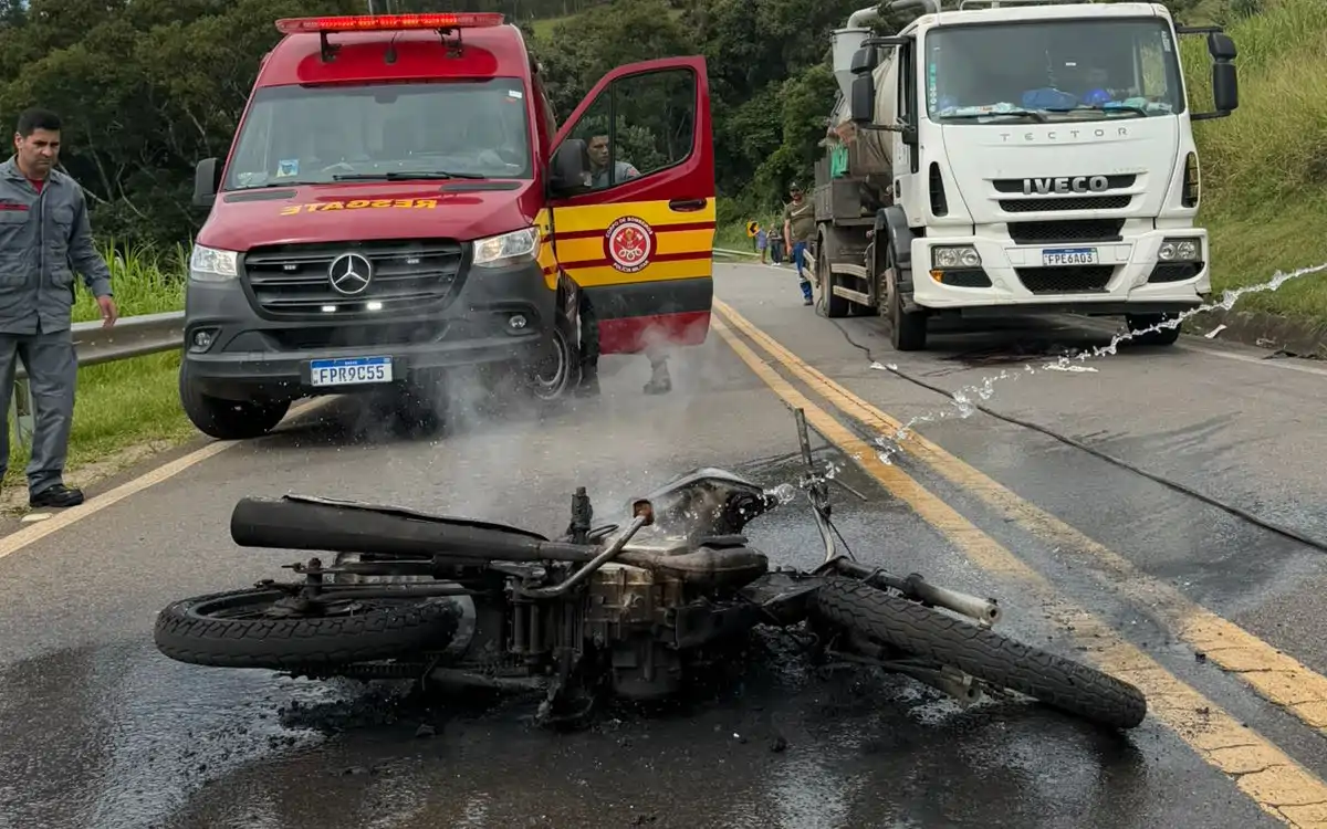 Com o impacto, o condutor da moto foi arremessado ao solo e sofreu ferimentos graves na perna. Após a colisão, a motocicleta começou a pegar fogo na pista, aumentando a gravidade da ocorrência.