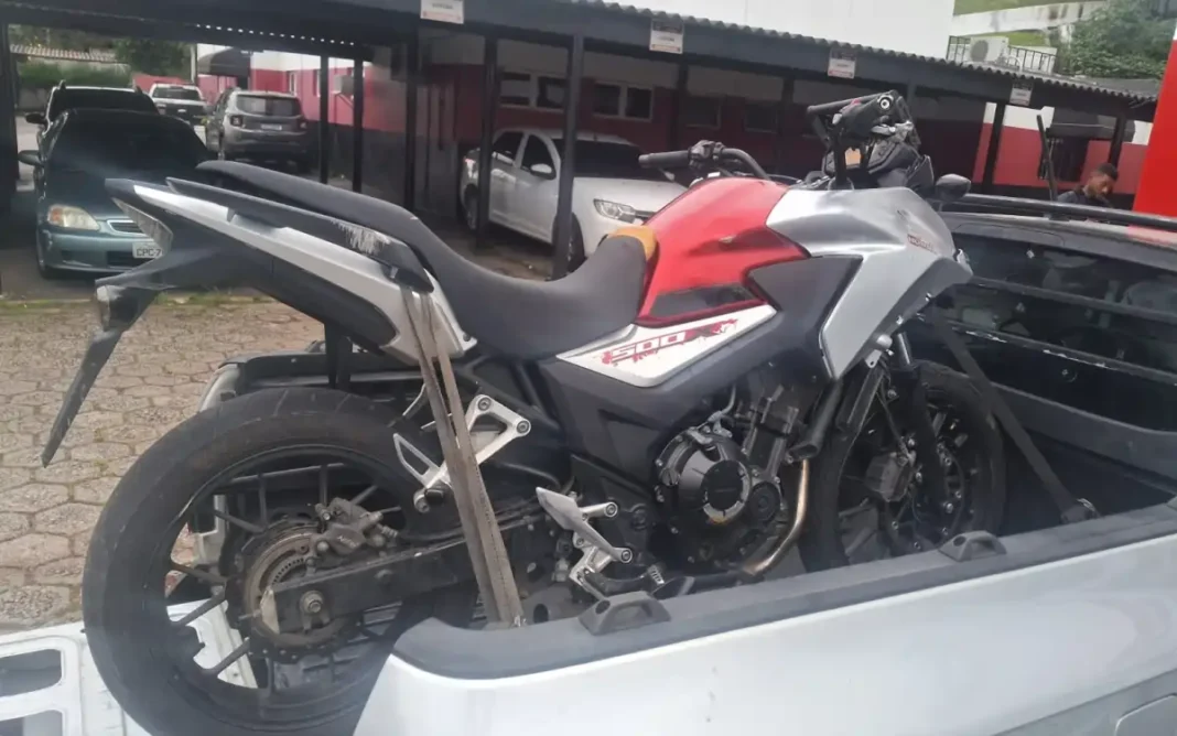 Durante a vistoria, os militares encontraram uma motocicleta Honda CB 500X sem emplacamento. Após análise, foi constatado que o motor estava completamente violado e que o chassi apresentava apenas cinco caracteres alfanuméricos legíveis, enquanto os demais estavam adulterados.