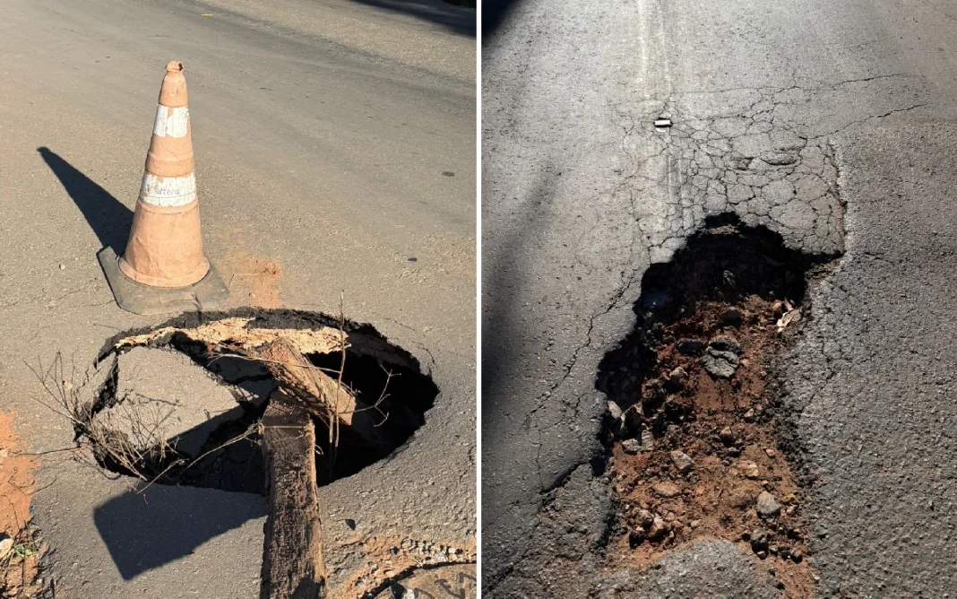 De acordo com os relatos, o local apresenta diversos problemas estruturais, incluindo uma cratera de grandes proporções que está se abrindo no asfalto, além de dois pontos de afundamento ao longo da via. A situação preocupa, principalmente pelo risco de o asfalto ceder a qualquer momento.