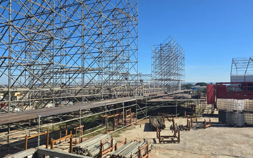 Na área de camarotes, a estrutura principal já foi finalizada, enquanto a colocação da lona de cobertura segue em andamento. O lounge anexo também recebeu estrutura metálica e cobertura. Já na área de alimentação, as tendas começam a ser instaladas, com parte delas já montada. O palco principal ainda está com a estrutura parcialmente concluída.