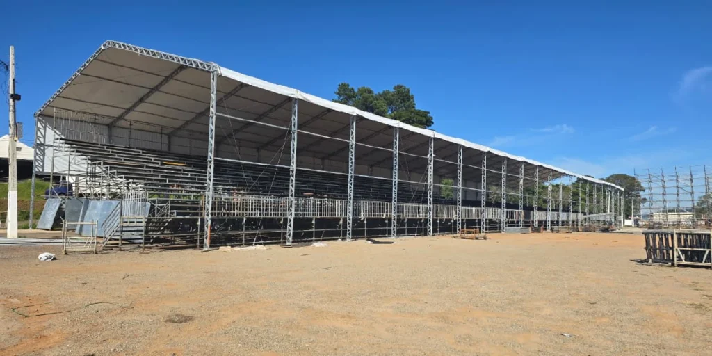 A montagem da estrutura da 59ª Expoagro e 32ª Festa do Peão de Bragança Paulista entrou na fase final, com avanço na instalação das principais áreas do evento, como arquibancadas, camarotes e espaços de convivência.