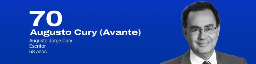 Médico psiquiatra e escritor best-seller, Augusto Cury ganhou notoriedade nacional e internacional com obras de autoajuda e desenvolvimento pessoal. Com trajetória fora da política tradicional, afirma buscar alternativas à polarização e propõe debates sobre educação, saúde mental e inovação tecnológica, incluindo inteligência artificial.