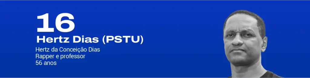 Professor de história e militante social, Hertz Dias atua também no movimento hip hop e em organizações culturais e políticas. Já foi candidato a vice-presidente em 2018 e representa o PSTU na corrida eleitoral, com foco em pautas trabalhistas e sociais.