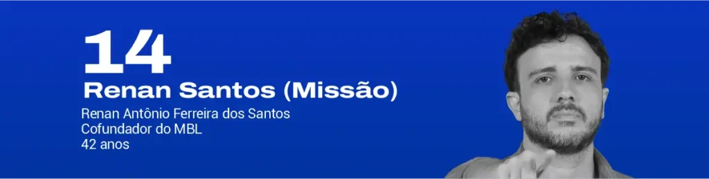 Fundador do Movimento Brasil Livre (MBL), Renan Santos é empresário e líder político do partido Missão. Com atuação ligada a movimentos de renovação política e crítica ao sistema tradicional, disputa sua primeira eleição presidencial.
