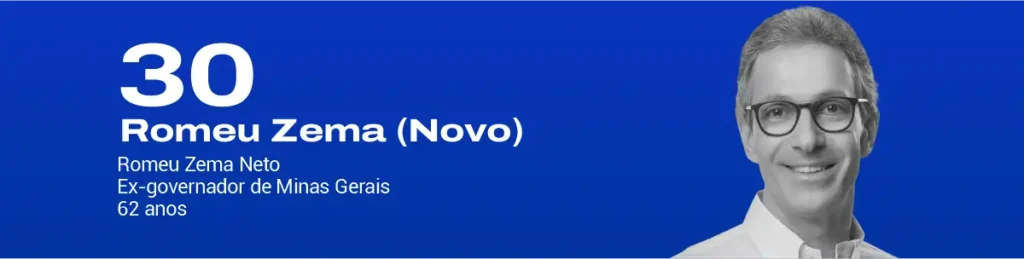 Empresário e governador de Minas Gerais, Zema entrou na política em 2018 e foi eleito já no primeiro pleito que disputou. Defensor de pautas liberais, como privatizações e redução do Estado, busca ampliar sua projeção nacional como alternativa à polarização política.