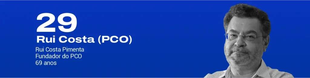 Jornalista e dirigente histórico do Partido da Causa Operária, Rui Costa Pimenta participou da fundação do PT e da CUT. Após divergências políticas, seguiu carreira em partidos de extrema esquerda, defendendo posições críticas ao sistema político e econômico atual.