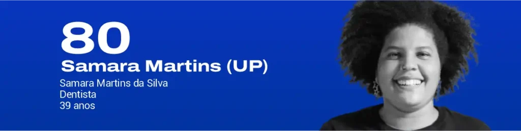 Dentista e militante social, Samara Martins atua em movimentos populares e de mulheres. Vice-presidente da Unidade Popular, já integrou chapas eleitorais em disputas anteriores e representa a legenda na corrida presidencial com foco em pautas sociais e trabalhistas.