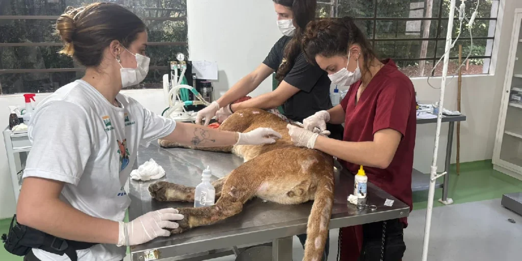 O animal foi resgatado em Bragança Paulista depois de ficar preso em uma armadilha de caça feita com cabo de aço. Segundo a equipe responsável, trata-se de um macho adulto que apresentava uma lesão extensa e profunda na região da cintura.